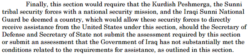 “وأخيرا، فإن هذا القسم يتطلب أن تعد البيشمركة الكردية وقوات الأمن القبلية السنية المشتركة في مهمة الأمن الوطني، والحرس الوطني العراقي السني كبلد، وهذا من شأنه أن يسمح لهذه القوات الأمنية تلقي المساعدة مباشرة من الولايات المتحدة تحت هذا القسم ، وينبغي لوزير الدفاع ووزير الخارجية ألّا يقدما التقييم المطلوب في هذا القسم أو تقديم التقييم الذي لم تقم الحكومة العراقية بالإيفاء بشروطه والتي تتعلق بمتطلبات المساعدة، على النحو المبين في هذا القسم”.