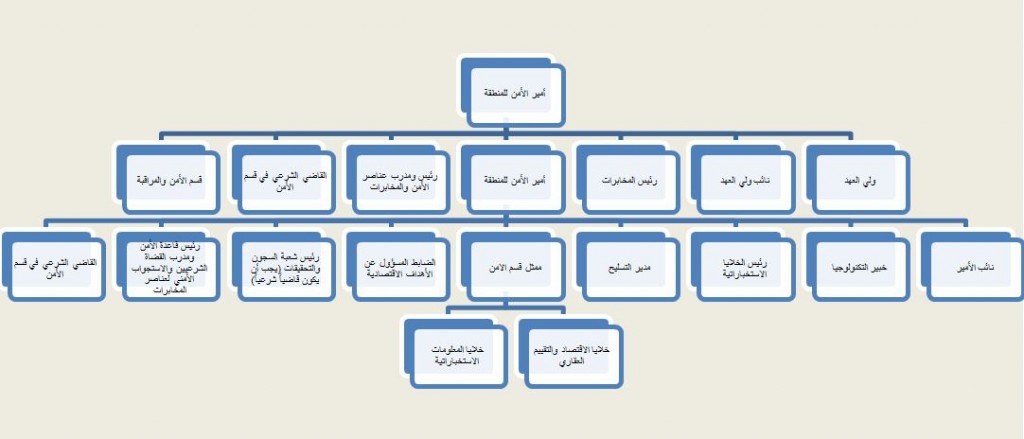 كانت الخطة تقضي منذ البداية بعمل أجهزة المخابرات بشكل متوازٍ مع بعضها البعض حتى على مستوى المحافظات. إذ يترأس قسم المخابرات العامة أميراً للأمن يشرف بدوره على نوابه في المقاطعات المختلفة. ويتلقى هولاء النواب تقارير من رؤساء الخلايا الجاسوسية ومدراء المعلومات الاستخباراتية لكل مقاطعة. كما يتلقى نائب الأمير تقارير أيضاً من أفراد الخلايا التجسسية على المستوى المحلي. فالهدف كان أن يراقب الجميع بعضهم. ويترأس أمير المقاطعة كذلك مدربي القضاة الشرعيين لتقصي المعلومات بينما يتولى الأمير المحلي مهمة الإشراف على قسم منفصل “لضباط الأمن”.