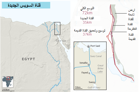 قال مهاب مميش، رئيس قناة السويس، في مقابلة تلفزيونية مؤخرا. “ان التجارة (العالمية) في تزايد، وأحجام السفن تتزايد، وإذا لم نتمكن من التعامل مع هذا وتحويله إلى إيرادات للخزينة المصرية، فان طرق بديلة ستظهر وتستفيد من هذا النمو” ان الارقام المستخدمة في هذا التوسع كبيرة بالتأكيد بيع 8.6 مليار دولار كشهادات استثمار للجمهور في ثمانية أيام فقط في العام الماضي لتمويل المشروع. أنجز المشروع في 12 شهرا فقط، ووظف 80 في المائة من القدرة التجريف في العالم لحفر قناة موازية جديدة يبلغ طولها 34 كيلو متر، وتعميق وتوسيع أجزاء من القناة القديمة. ويقول مسؤولون، ينبغي لهذا المشروع ان يجذب المزيد من الشحن عن طريق تمكين السفن من الابحار في كلا الاتجاهين في جميع الأوقات، وسوف تقلل أيضا وقت الانتظار من 11 ساعة حاليا إلى ثلاث ساعات فقط.