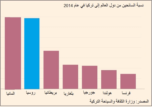تعتمد تركيا على السائحين الروس اذ بلغ عدد سيائحها خلال عام 2014 ما يقارب من 4.5 مليون سائح من أصل 42 مليون سائح زاروا تركيا خلال العام بنسبة 12.2 بالمئة لتكون روسيا في المرتبة الثانية بعد ألمانيا بحسب إحصاءات وزارة السياحة التركية وبدخل للاقتصاد التركي يقارب من 36 مليار دولار، الا ان قرار شركات السياحة الروسية بعد توصيات من اتحاد السياحة الروسي بوقف الرحلات السياحية إلى تركيا، سيضر بقطاعات سياحية تركية. وتأتي روسيا بالنسبة لتركيا في المرتبة الثانية بعد ألمانيا التي اذا زار نحو 5.4 مليون سائح الماني تركيا العام الماضي.