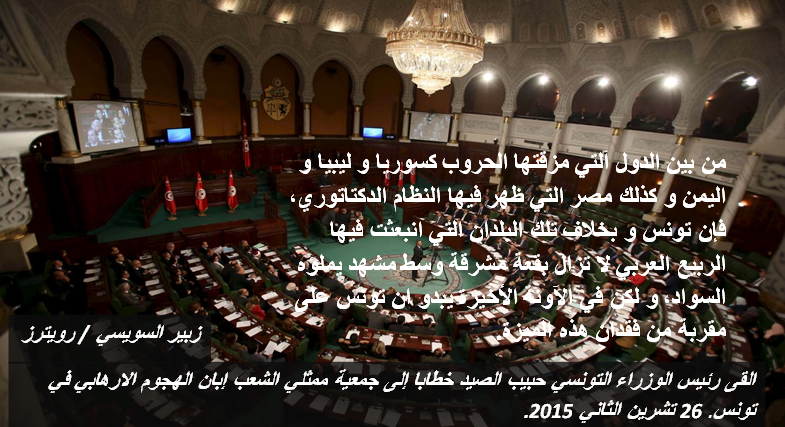 ان اطاحة تونس بالنظام الاستبدادي لزين العابدين بن علي عام 2011 ألهم الشعوب في شمال افريقيا و الشرق الاوسط بالانتفاض على حكوماتهم الاستبدادية و عرفت هذه الانتفاضات فيما بعد بالربيع العربي. بعد مرور ما يقارب الخمس سنوات استطاعت تونس الحفاظ على استقرارها النسبي و تشكيل حكومة وحدة وطنية بقيادة الحزب العلماني (حركة نداء تونس) و بالاضافة الى الحزب العلماني فان الحكومة تضم ايضا الجماعات الاسلامية . بعد انتهاء الثورة في تونس اشاد الجميع بعملية الانتقال السلسة و الناجحة الى النظام الديمقراطي.
