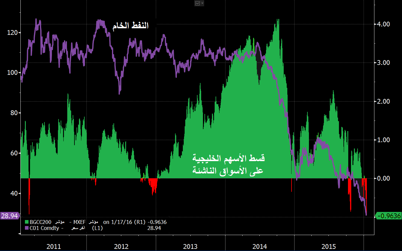 أدى انهيار النفط إلى تحفيز المستثمرين على تسعير سعر مؤشر 200GCC الأسواق الناشئة الى ادنى مستوى له خلال ما يقرب من خمس سنوات. وبدأت إيران، التي تمتلك ما يقرب 10 في المئة من احتياطيات النفط المؤكدة في العالم، الاستعدادات لزيادة الصادرات بعد ان قالت الوكالة النووية التابعة للامم المتحدة يوم السبت بأن البلاد قد امتثلت لشروط الاتفاق الدولي للحد من برنامجها النووي. كما ان هذا يهدد بوضع المزيد من الضغوط على الأسعار، وسيسبب ضرر على الاقتصادات المعتمدة على النفط من دول مجلس التعاون الخليجي.