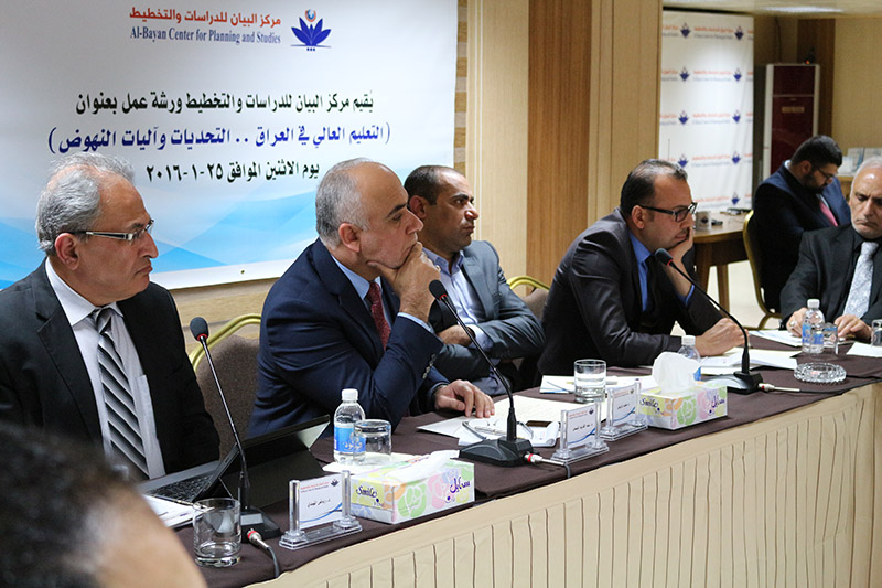 أقام مركز البيان للدراسات والتخطيط ورشة عمل بعنوان (التعليم العالي في العراق .. التحديات وآليات النهوض) واستضاف فيها الدكتور رياض المهيدي التدريسي في جامعة سوين برن الأسترالية ، والدكتور محمد الربيعي التدريسي في جامعة دلبن – لندن ، وقدم خلالها الباحثان تجربتهما خارج العراق في مجال التعليم العالي وسبل معالجة أهم المعوقات التي تواجه التعليم في العراق ، وشارك في الورشة عدد من الأساتذة الجامعيين والأكاديميين وبعض رؤساء الجامعات العراقية وعمداء الكليات العلمية والإنسانية ، فضلاً عن وكيل وزير التعليم العالي الدكتور فؤاد قاسم محمد والمفتش العام لوزارة التعليم العالي الدكتور ضياء محمد مهدي ، وترأس الجلسة الدكتور عبد الكريم الفيصل رئيس هيئة المستشارين ، إذ قدم الدكتور رياض المهيدي ورقته التي تضمنت عدداً من النقاط وكان في بدايتها أن هناك جيلاً من التدريسيين يحتاج إلى التدريب ليؤدي دوره بطريقة أفضل لأنّهم هم قياديو المستقبل معتبراً إنّ التدريب ضرورة ملحة في الوقت الحالي وهو عملية صعبة في الوقت ذاته، كما أشار إلى إنّ هناك 60% من الكوادر من حملة الماجستير ليس لديهم خبرة في مجال التعليم العالي بسبب عدم توفر فرصة مناسبة لتدريبهم بشكل جيد وهذا من شأنه أن يعمق من الهوة في عملية التواصل بينهم وبين الطلاب والذي سيؤدي إلى خريج غير كفوء.