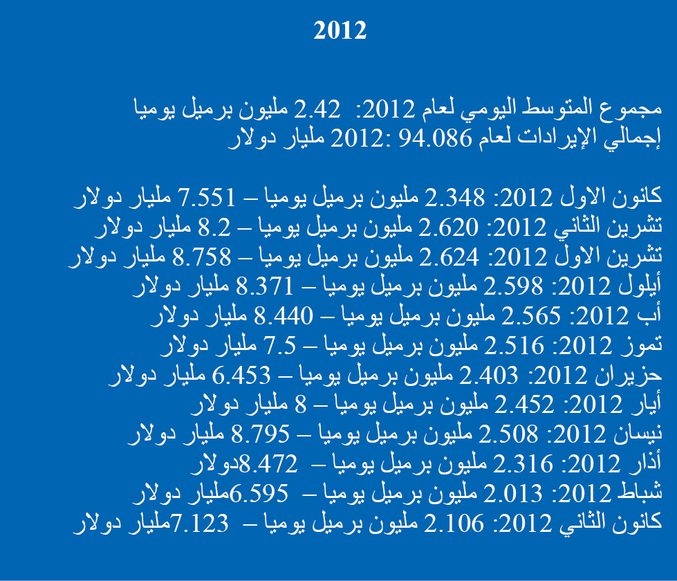 وفيما يلي متوسط صادرات النفط الخام اليومي للحكومة الاتحادية العراقية وإجمالي الإيرادات بالاشهر منذ عام 2011 كما ذكر من قبل وزارة النفط، ولا تشمل هذه الأرقام النفط الذي يباع بشكل مستقل من قبل حكومة إقليم كردستان: