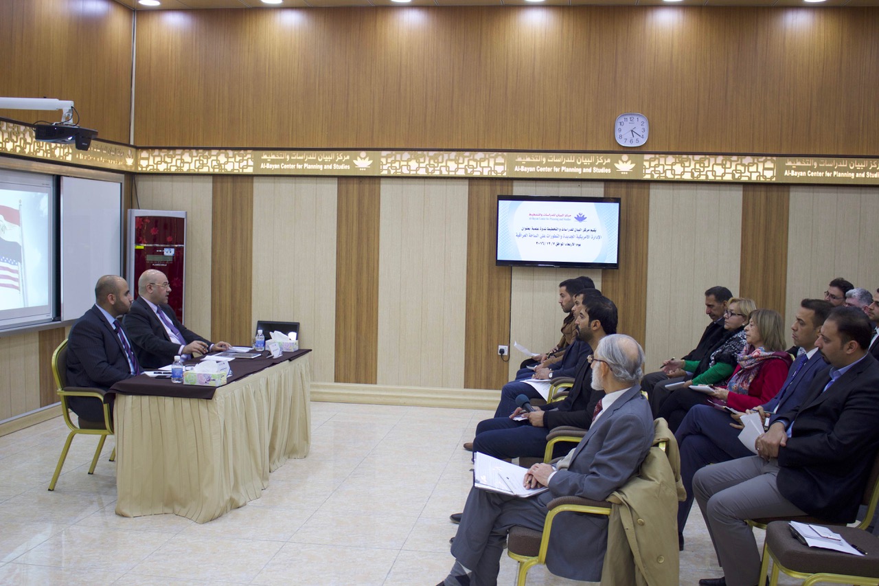 عقد مركز البيان للدراسات والتخطيط يوم الأربعاء الموافق 7 / 12 / 2016، ندوة بعنوان (الإدارة الأمريكية الجديدة والتطورات على الساحة العراقية)، وذلك ضمن سلسلة فعالياته لعام 2016، واستضافت الندوة السفير العراقي السابق لدى الولايات المتحدة الأمريكية الأستاذ لقمان الفيلي، وبحضور نخبة من الباحثين والمفكرين والأكاديميين وممثلي مراكز البحوث والدراسات العراقية.
