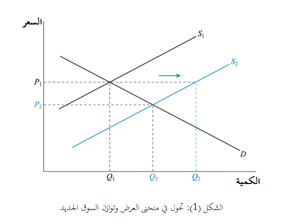 تسبب دخول بنوك جديدة في القطاع المصرفي العراقي بتغيير توازن السوق بسبب زيادة العرض، إذْ إن وجود قيود على القطاع المصرفي قد تعني أن المنافسة ليست عالية كما هو متوقع، وأن المستهلكين لا يحصلون على العروض المثلى وذلك لتراجع العرض، أما من ناحية الطلب فلا يبدو أن هناك تزايداً يستحق الذكر -بسبب الزيادة في حجم السوق بحركة أفقية حينما يقوم العملاء بتبديل حساباتهم من مصرف إلى آخر- وقد تكون المصارف الجديدة هي من تسببت بهذه الحالة، وما يحدث هو وجود تحول في منحنى العرض إلى جهة اليمين؛ الأمر الذي سيؤدي إلى تحقيق توازن جديد في السوق (انظر الشكل (1) في أدناه)، تقوم البنوك الجديدة باستهداف مستهلكين جدد من خلال تقديم منتجات جديدة، وتحسين عملية الوصول إلى المصرف، واستخدام التكنولوجيا لجذب الزبائن من بنوك أخرى وتقويض منافسيهم.