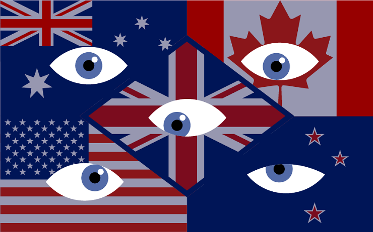 يضم تحالف منظمة العيون الخمس المؤسسات الاستخبارية الآتية: وكالة الأمن القومي الأميركية، والقيادة العامة لاتصالات حكومة المملكة المتحدة، ومؤسسة أمن الاتصالات الكندية، والمديرية الأسترالية للإشارات، ومكتب أمن اتصالات الحكومة النيوزيلندية. ويتحرك جهد المنظمة في: