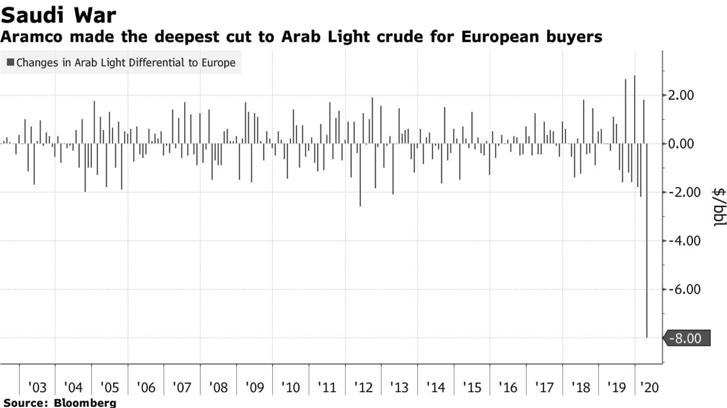 وفي واحدة من أهم حركات التسعير، زادت أرامكو الخصم على الخام العربي الخفيف الذي يباع إلى مصافي التكرير في شمال غرب أوروبا بمقدار 8 دولارات للبرميل، وعرضته بسعر أقل بـ 10.25 دولار للبرميل من مؤشر برنت. في المقابل، يقل سعر الأورال -مزيج النفط الروسي الرائد- عن سعر البرنت بنحو دولارين. وقال التجار إن الخطوة السعودية كانت بمنزلة هجوم مباشر على قدرة الشركات الروسية على بيع الخام في أوروبا.