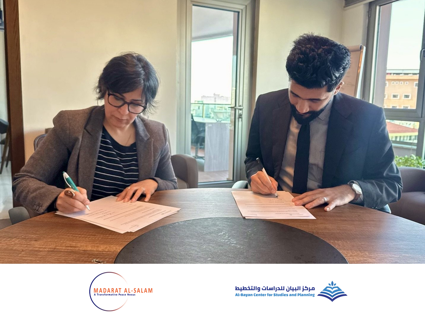 وقع مدير قسم البرامج في مركز البيان للدراسات والتخطيط، السيد محمد شاهات نيابةً عن المدير التنفيذي للمركز مذكرة تفاهم مع السيدة زينب قاسم المدير التنفيذي لمنظمة مدارات السلام. وتهدف هذه المذكرة إلى تعزيز العمل المشترك في أربعة برامج مختلفة.
