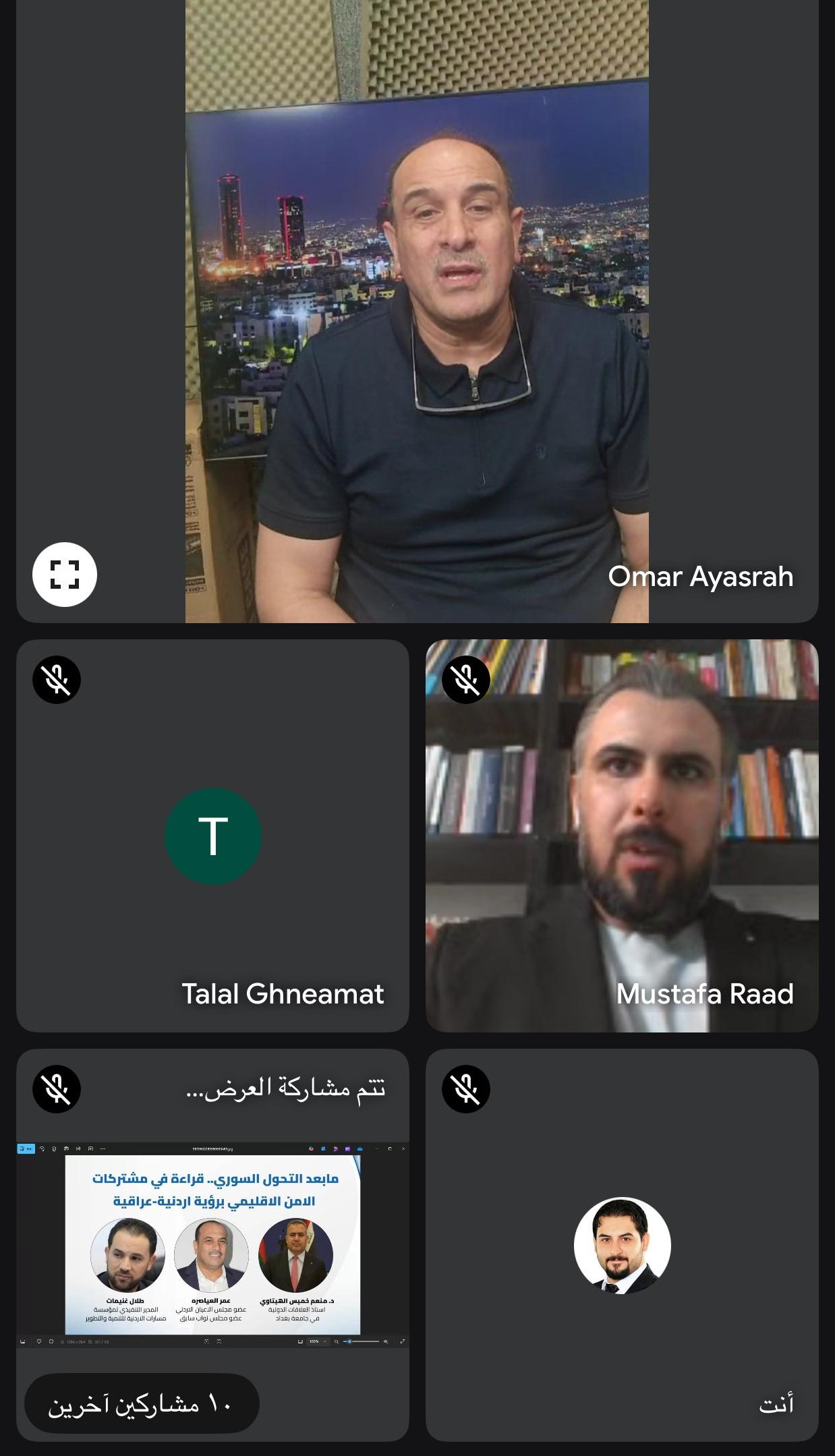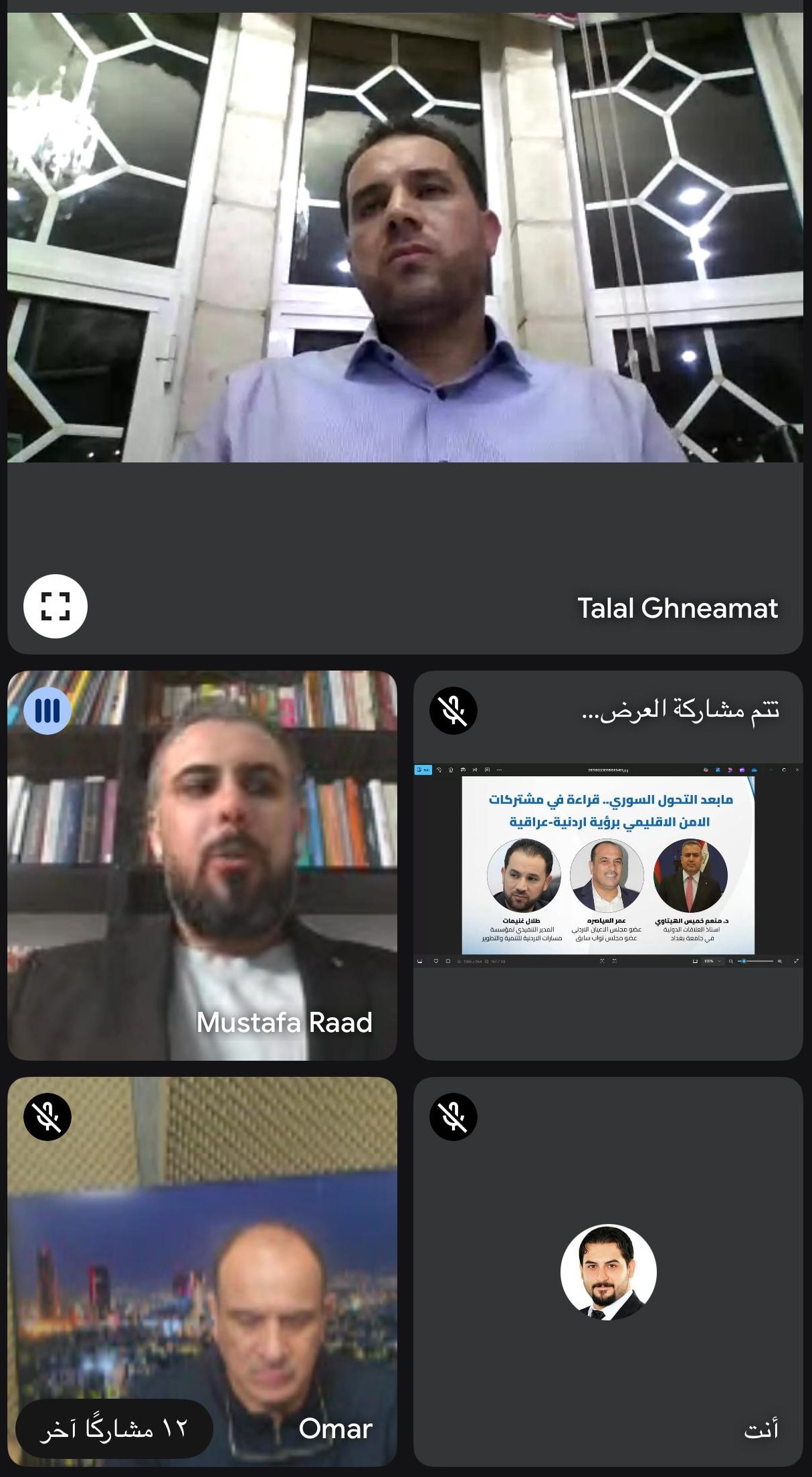 كما أشار المتحدثون إلى وجود تيار سياسي عراقي يتفهم ويتقبل الوضع السوري، مع التأكيد على أهمية تعزيز التفاهمات العراقية–الأردنية–السورية، خصوصاً في ملف التنسيق الأمني، لتفادي نشوء مناطق رخوة على الحدود يمكن أن تستغلها الجماعات المسلحة. كما أوضحوا أن العراق يراقب عن كثب تطورات المشهد السوري، ويرى في نفسه شريكاً محورياً في التنمية الإقليمية عبر مشاريع الربط البري والكهربائي بين البلدان الثلاث.