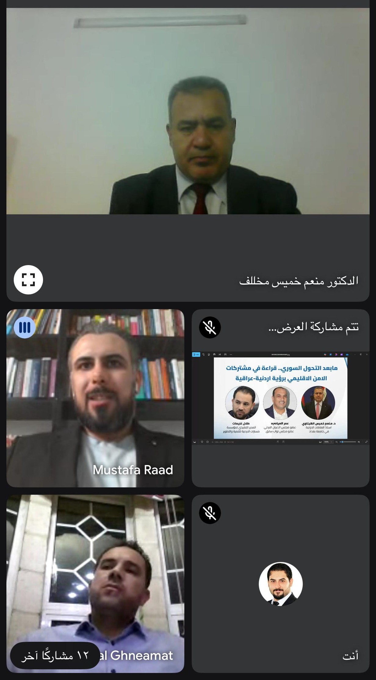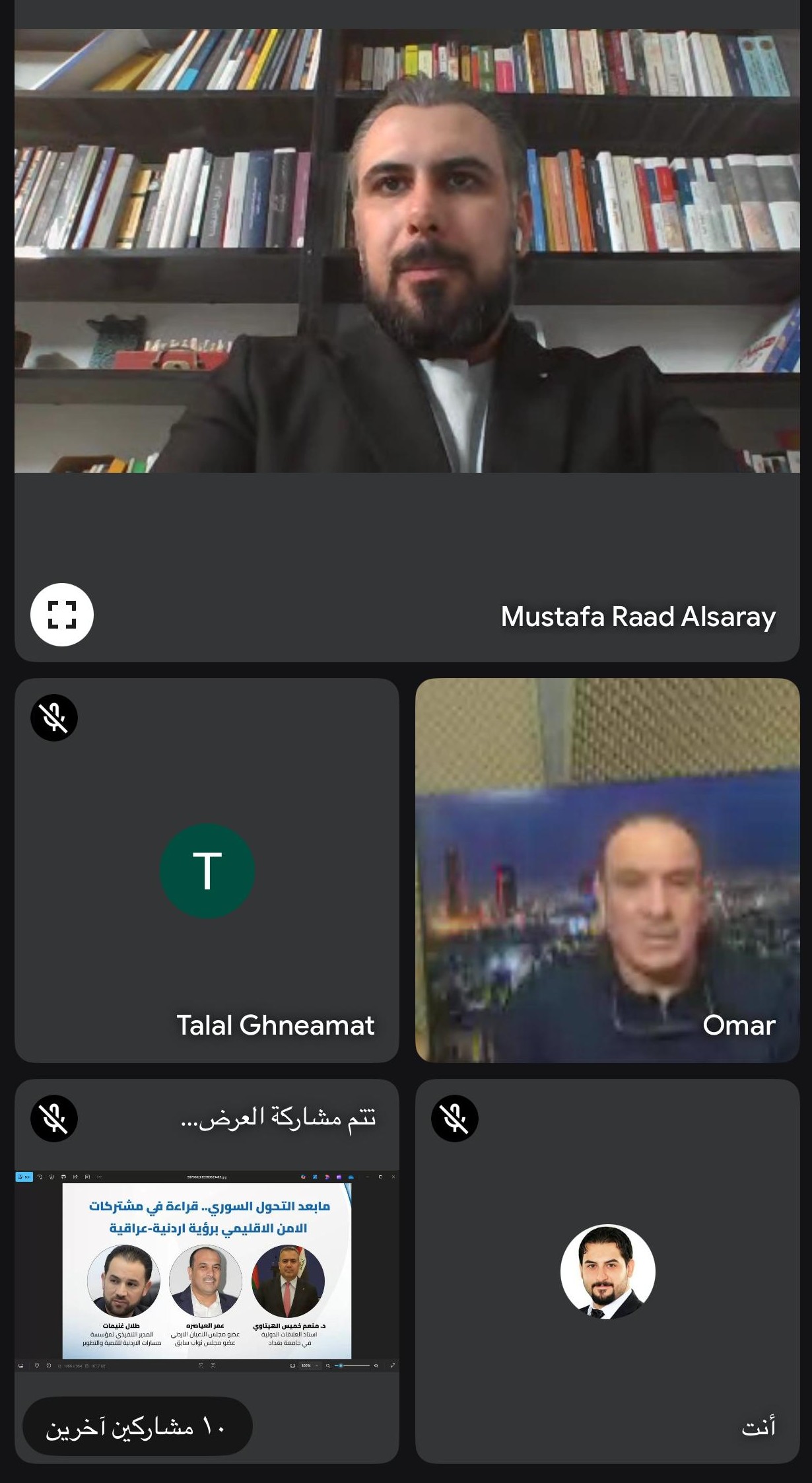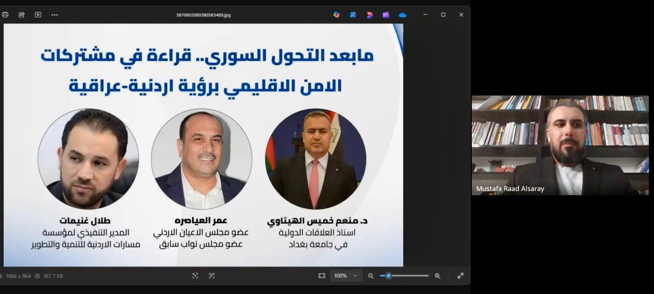 أقام مركز البيان للدراسات والتخطيط جلسة حوارية إلكترونية بعنوان “ما بعد التحول السوري.. قراءة في مشتركات الأمن الإقليمي برؤية أردنية–عراقية”، بمشاركة نخبة من الخبراء وصناع القرار من العراق والأردن، لمناقشة التحولات في الملف السوري وانعكاساتها على الأمن الإقليمي.