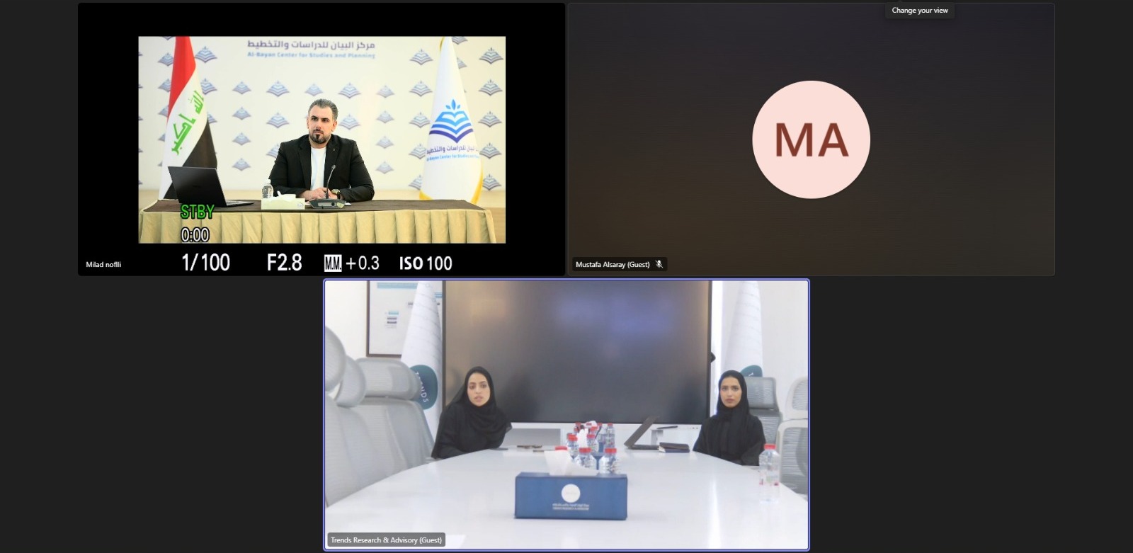 عقد مركز البيان للدراسات والتخطيط لقاءً، عبر دائرة تلفزيونية مغلقة، مع مركز تريندز للبحوث والاستشارات في الإمارات العربية المتحدة؛ بهدف مناقشة آفاق التعاون المشترك وتعميق الشراكة الاستراتيجية بين الجانبين.