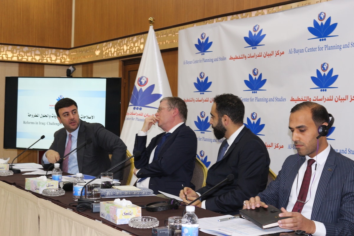 The second session explored the country’s current economic status and addressed how Iraq can curtail public sector spending. The session was chaired by Al-Bayan Center’s head of research, Ali Al-Mawlawi, and featured Dr. Mudher Salih, finance advisor to the Prime Minster, Ambassador Ramon Blecua, head of the European Union delegation to Iraq, and Christine van den Toorn, director of IRIS at the American University of Iraq in Sulaimaniyah. Discussions focused on job creation in the private sector, provision of technical expertise through public financial management reform, and relations between Baghdad and Erbil.